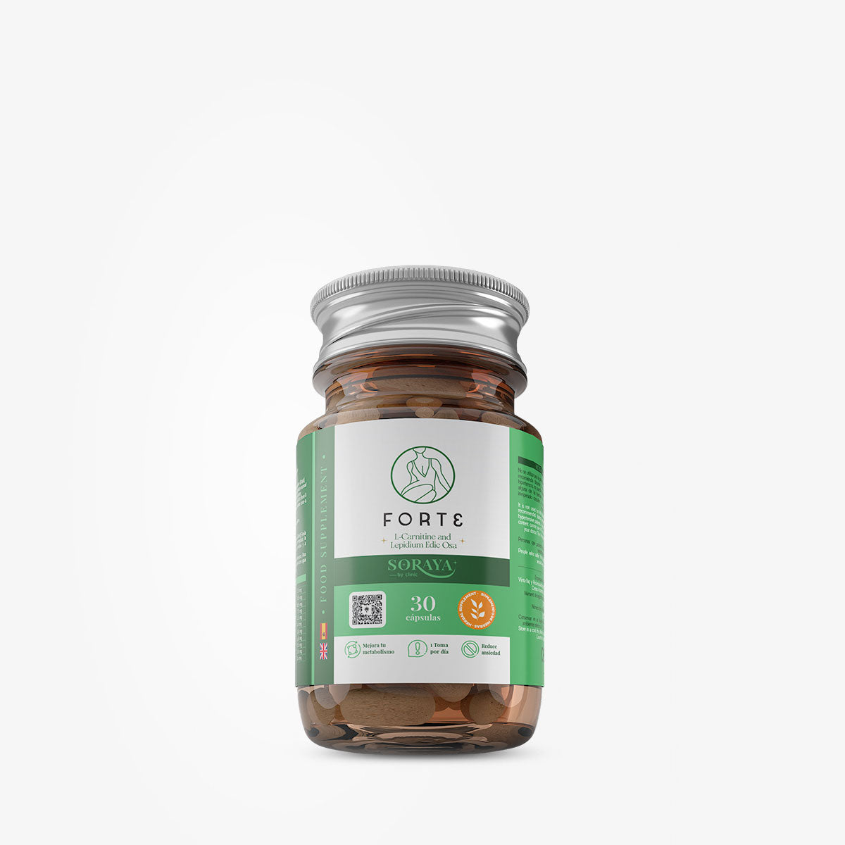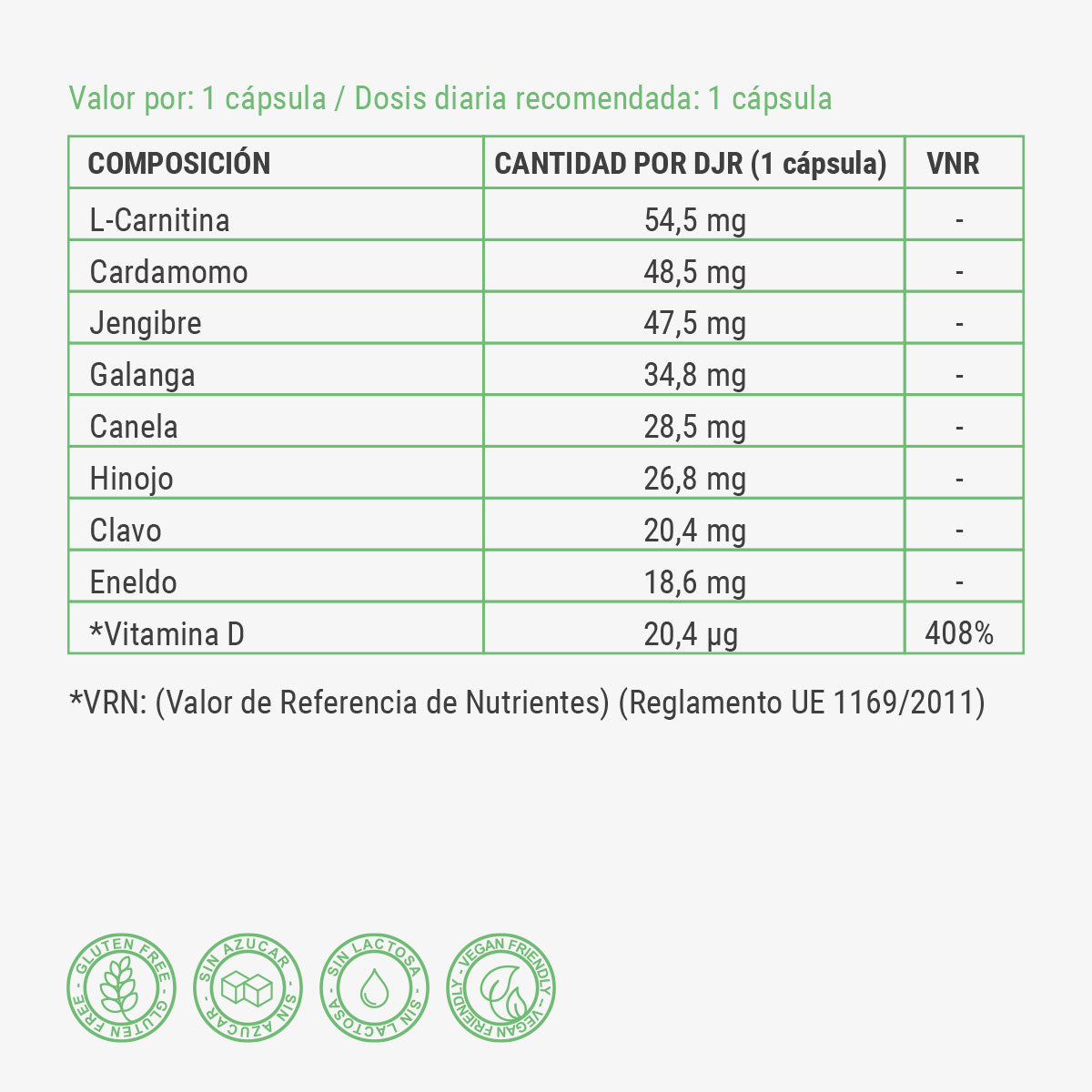 Complemento alimenticio en cápsulas a base de L-carnitina, extractos de plantas y vitamina D.